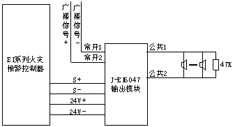 與音箱間的連接由J-EI6047型輸出模塊進行控制,如下圖所示,“常開1”、“常開2”為消防廣播音頻輸入端,分別接廣播區(qū)域控制盤的音頻輸出負極、正極;“公共1”、“公共2”為音頻信號輸出,接音箱,在線路的末端應接47kW負載電阻。