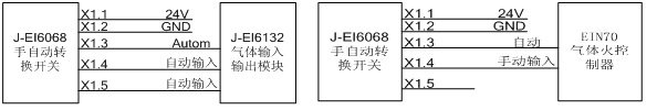 X1.1、X1.2分別接DC24V、GND,X1.3、X1.4、X1.5分別接EI6132輸入/輸出模塊的“Autom”、“自動輸入”、“自動輸入”端。