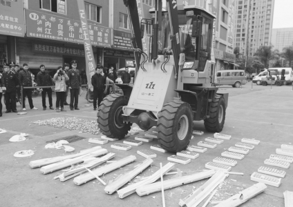 “銷毀!”3月14日上午9點(diǎn)半,在成都市金府機(jī)電城的廣場(chǎng)上,消火栓箱、防火門、排煙防火閥、消防水槍、灑水噴頭等消防產(chǎn)品擺了一地,但是和正規(guī)產(chǎn)品不同,現(xiàn)場(chǎng)的這8類消防產(chǎn)品,都是偷工減料的偽劣品?! ?/p>