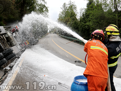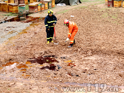救援官兵立即對(duì)現(xiàn)場(chǎng)進(jìn)行警戒,杜絕一切火源,并使用泡沫對(duì)油罐車罐體進(jìn)行降溫、對(duì)泄漏油品進(jìn)行稀釋,并建立圍堤對(duì)泄漏油品進(jìn)行堵截,以防出現(xiàn)二次污染,同時(shí)使用手抬機(jī)動(dòng)泵抽取附近池塘水源進(jìn)行供水。