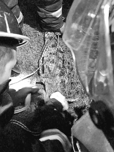 幾名消防官兵穿上戰(zhàn)斗服和靴子,戴上手套,全副武裝,躡手躡腳接近鱷魚,并用木棒輕輕敲打鱷魚背,鱷魚驚醒后,抬起頭,消防官兵閃身在一旁躲避,只見鱷魚爬上水溝坡,幾名消防官兵圍上去丟了一條帶有活結(jié)的繩索,慢慢接近其頭部后,將活套迅速套上鱷魚脖子并勒緊,同時(shí)用腳踩住其尾巴,直到用繩索將其徹底縛住。隨后林業(yè)部門將其帶走。